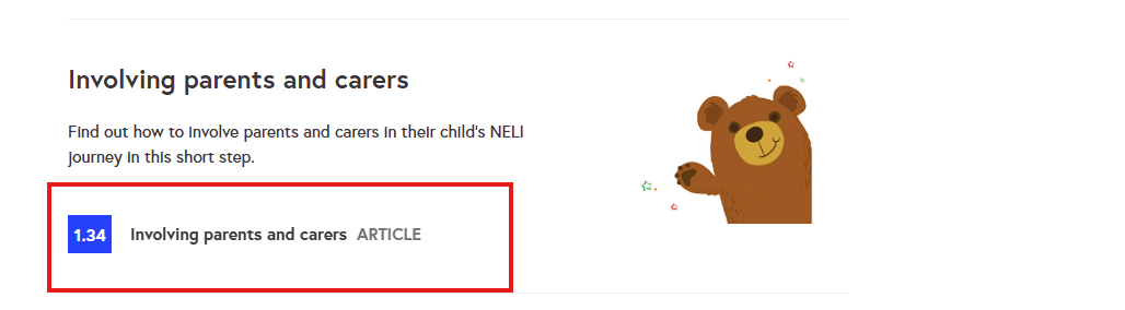 Within the online training materials there are some resources (a template introductory information letter and template newsletters) to keep parents and carers informed about the NELI programme’s progress. These are located on Step.134 of the NELI Support Hub (Involving Parents and Carers).