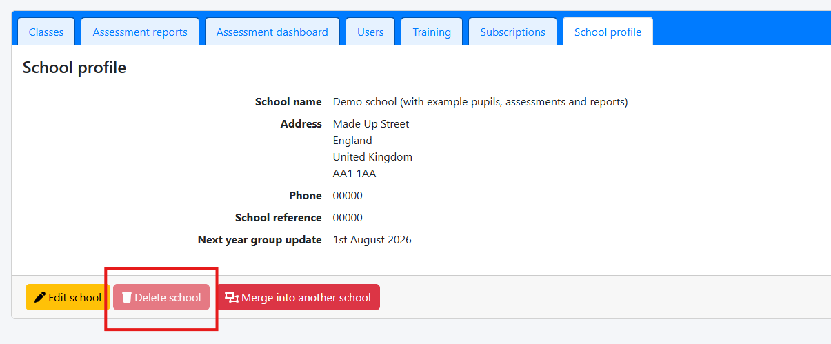 To delete a school’s account you must first delete all students and classes. Once this has been done, please navigate to ‘School profile’ and press the red button ‘Delete school’.