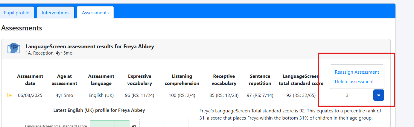 To delete a pupil’s profile and associated assessment and intervention data, go to the pupil’s profile and select ‘Delete pupil’.