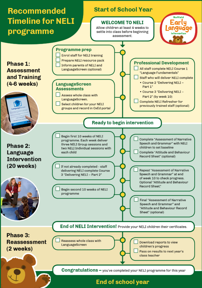 The 20-week programme includes materials to deliver three 30-minute small group sessions a week and support to provide two 15-minute individual sessions for each targeted child. Therefore, if 5 children were to receive NELI, a member of staff would need 4 hours of delivery time each week for 20 weeks. Additional preparation time is required to ensure staff have read the manual and prepared the correct picture cards ahead of each group session, as well as time to reflect on what individualised support children may need for their 1:1 session.
