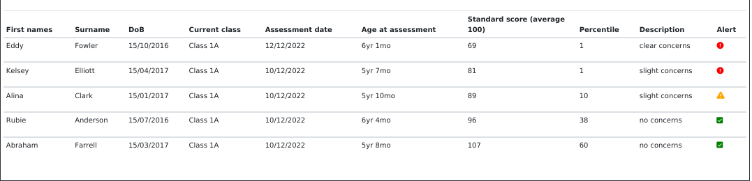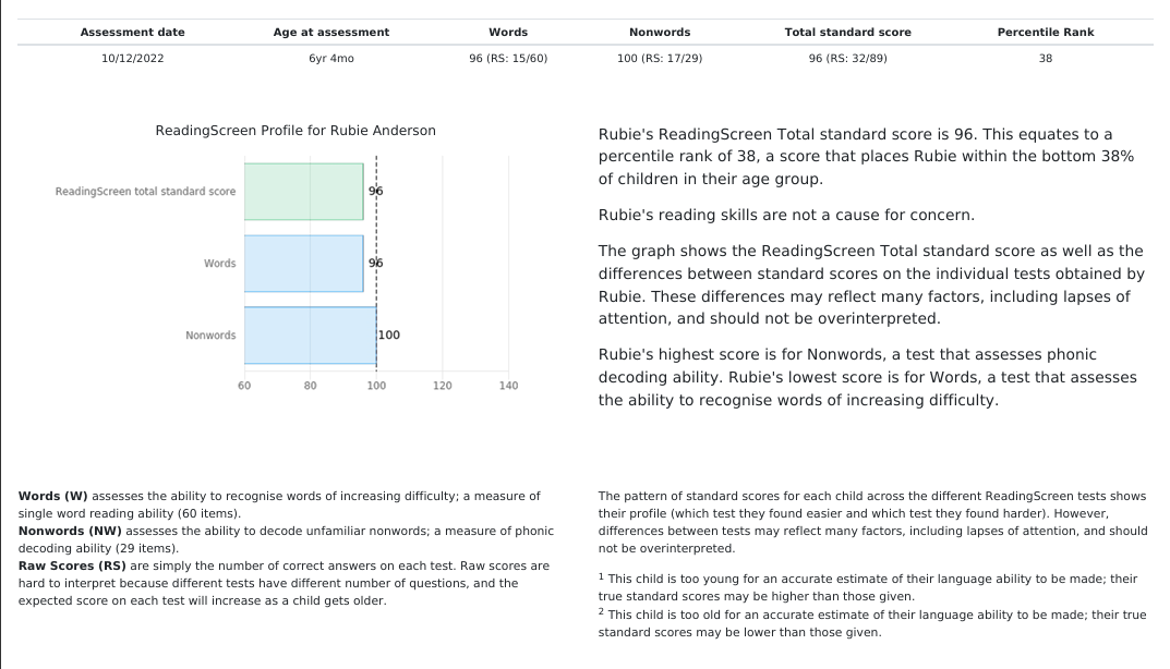 The ReadingScreen report provides the scores for each child assessed in your school on ReadingScreen.