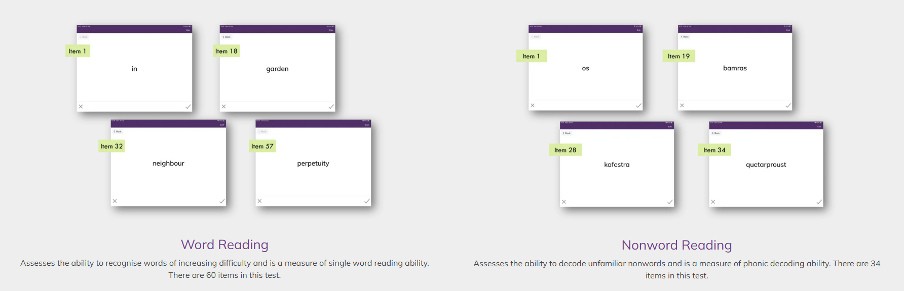 ReadingScreen is a quick and accurate digital assessment of word and nonword reading for 5-12 year olds. It can be administered by teachers, teaching assistants or any adult. It is quick to use, taking between 2-10 minutes per child and will identify children requiring extra support to develop decoding skills.