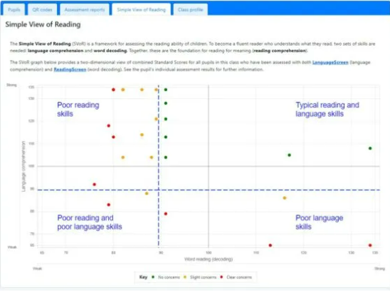 When students are assessed with both LanguageScreen and ReadingScreen you get an instant view of their scores on a graph representing the Simple View of Reading. This clearly highlights whether students have problems with decoding, comprehension or both so you can easily see what kind of additional support the children in your class may need.
